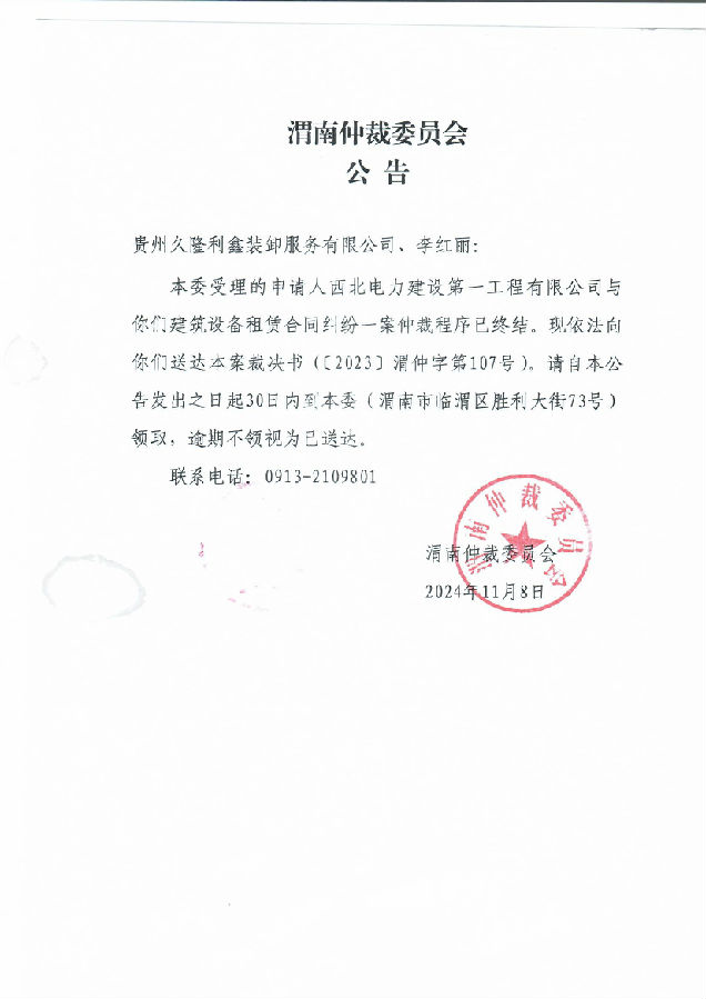 貴州久隆利鑫裝卸服務(wù)有限公司、李紅麗與西北電力建設(shè)第一工程有限公建筑設(shè)備租賃合同糾紛案公告